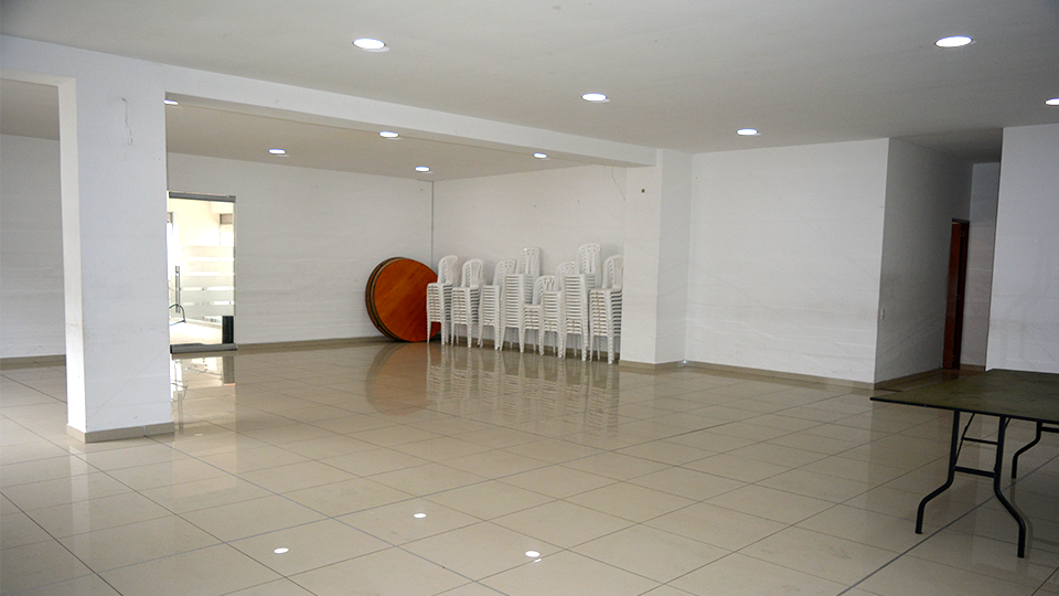 Cuenta con 100 sillas plasticas tipo Rimax, 10 mesas redondas de 1.50 mts2, 3 mesas rectangulares de 2.50 mts x 1 mt y tres mesas plasticas tipo rimax de 1 x 1 mts.